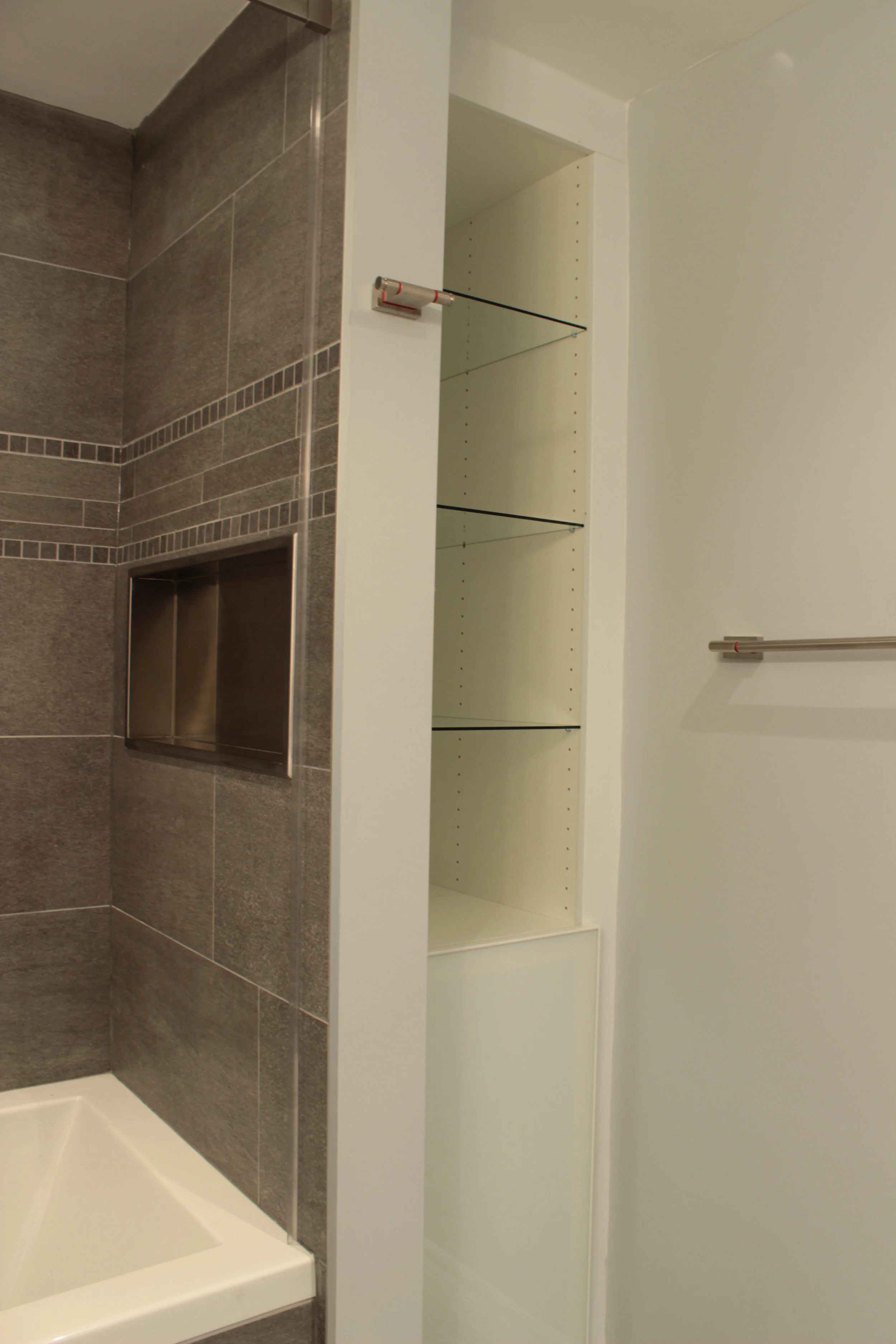 Additional features in this bathroom include – the wall niche in the shower area, open storage with glass shelves, and enclosed storage below. We installed a Flory de Colt jetted bathtub from Alcove and added a rolling glass door. The floating vanity is custom made from K-Wood Kitchens; the counter-top is a solid-surface quartz product with a Stainless Steel Sink.